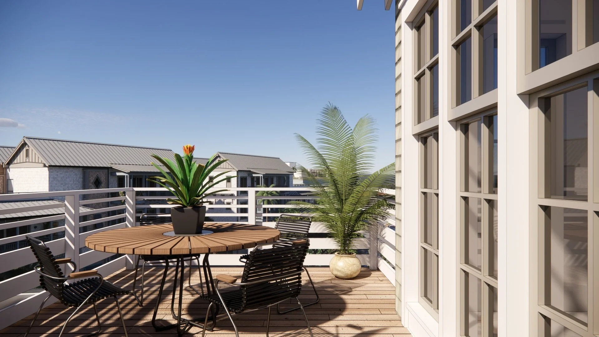 The “Coastal Couple” presents two new custom townhomes with matching floor plans, but a very different exterior character. They’re buddies, not twins, offering of family getaways on the Gulf Coast of Florida. Each level includes a unique outdoor living space, with a ground floor plunge pool screened by thick saw palmetto, an outdoor grill deck and dining room adjacent to the kitchen, and a fourth-level rooftop terrace for soaking up those unbelievable 30A sunsets.