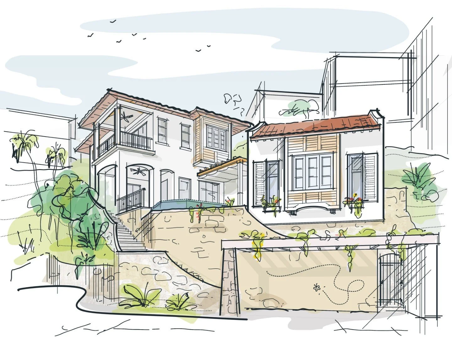 Scrambling up a Pacific coast hillside, Ladera 101 is worth the climb. This new residence is split into two distinct structures - the primary home, entered thru a refreshing outdoor dining room, and a secondary “casita” for frequent guests. When you see the crescent-shaped pool terrace that connects the two homes, it’s no wonder that so many guests seem to drop by! The casita is topped by a partially-covered outdoor terrace that offers shade from the relentless summer sun and frames an enviable view of the sunset as it drops over the tile roofs of town.