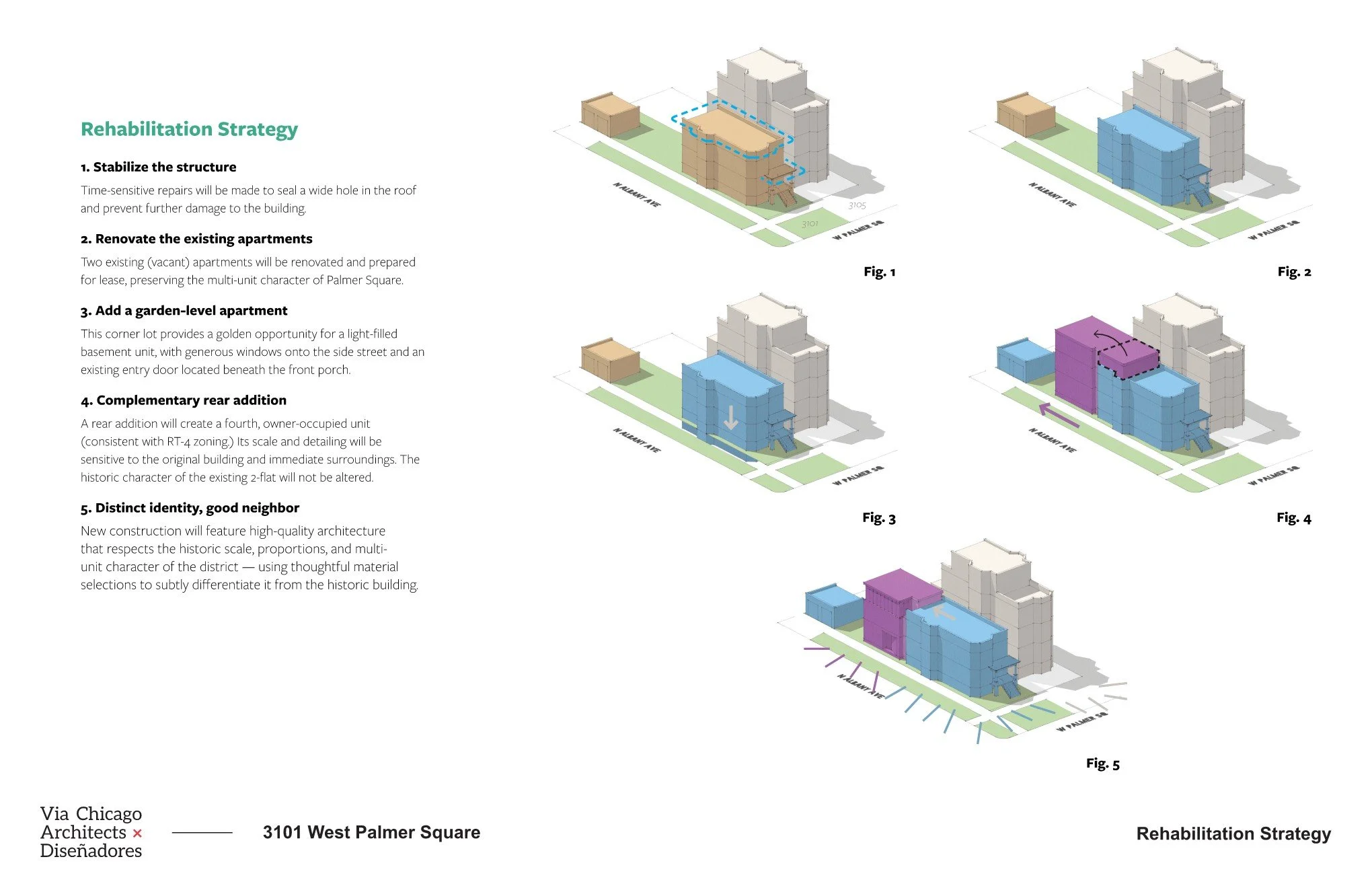 The architects behind Via Chicago purchased this neglected two-flat in early 2025, and will serve as both architect-and-developer behind a creative reuse of the building. Located just two blocks from our Armitage studio, it presents a valuable opportunity to introduce new housing units in a community that is very publicly struggling with an accelerating loss of 2- and 3-flat buildings as they are converted into oversized single-family homes.