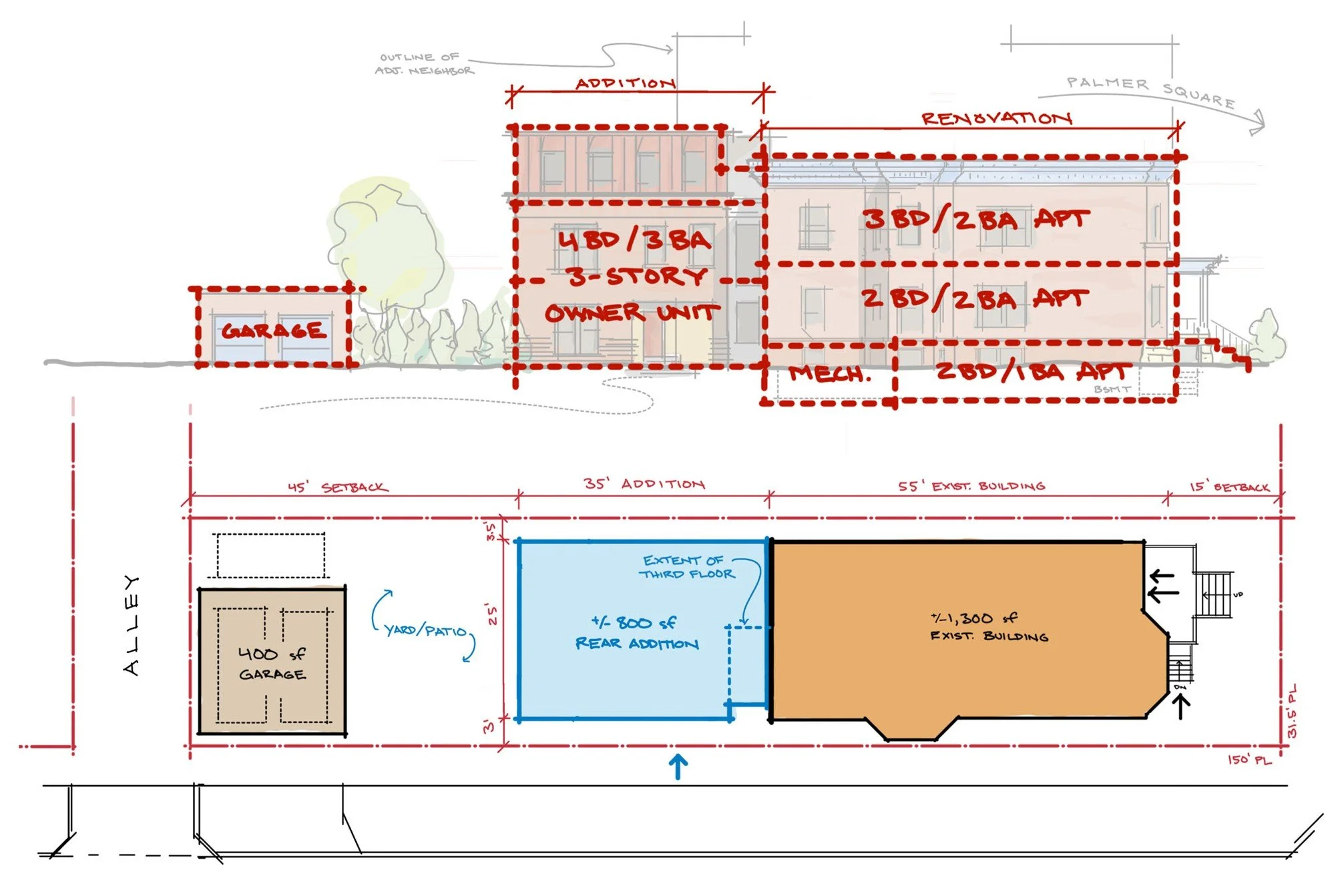 Palmer+ will carefully restore the unique exterior features of this two-flat — a unique blend of iron spot brick with extra-thin “butter joints” in a matching mortar color, the ornate wood porch columns, and the infamous powder-blue cornice. The interior apartments will be fully renovated, and a new garden apartment with its own private entry will be re-introduced to the lower level. Owner-occupied two-flats are increasingly difficult to maintain, when faced with skyrocketing land costs beneath each property. To make the project financially viable, the project will use the corner location and extra-deep lot size to add a new townhouse-style, owner-occupied unit at the rear of the historic building. This addition will include a strong brick base, contextual window sizing & rhythm, and a compatible massing that reflects the eclectic low-rise character of the block. The top level will feature a metal cladding that continues the architectural statement established by the oversized metal cornice on the historic structure.